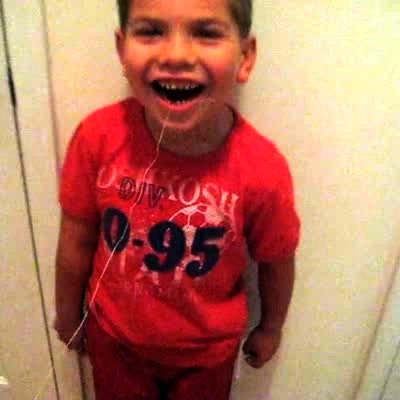 Boy ties 1 end of dental floss to his loose tooth the other to the door knob. Boy slams the door closed has a good reaction to his tooth coming out.