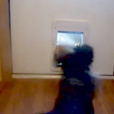 A man calls for a Terrier dog, and the dog struggles to squeeze itself through the opening of a doggy door in the house.