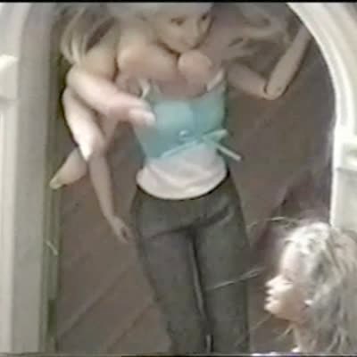 Teen girl squeezes through the small door of a Barbie play house. Funny visual.