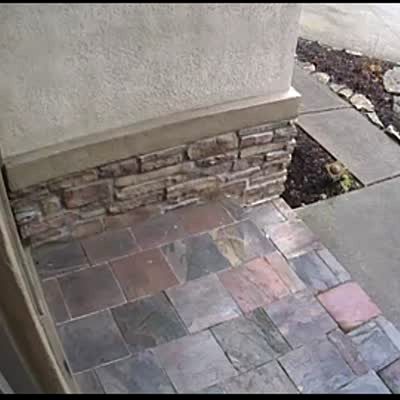 A woman runs towards a porch and falls on her face as she hits the step. Security Camera Footage.