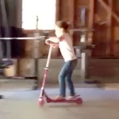 A young girl rides a Razor scooter and hits her head on the garage door.
