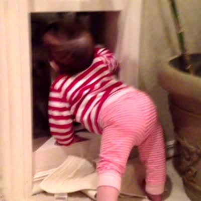A seven month old girl blocks dog from coming in through doggy door. Dog finally gets through and goes between tot's legs. Caucasian.