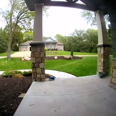 A woodpecker bird pecks a doorbell outside of a house, then it flies away, and a teen boy comes out of the house and looks around. Security footage.