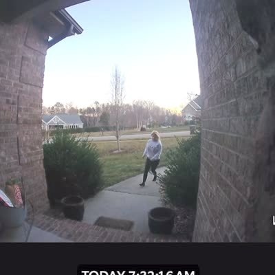 A woman walks up to a door to a house and accidentally hits her face on the glass screen door when she looks in. Security Footage.