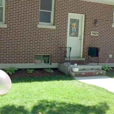 A boy tries the mentos and soda experiment outdoors and is joined by his two jumpy dogs. The soda container knocks over and sprays him with soda and the dogs run around wildly.