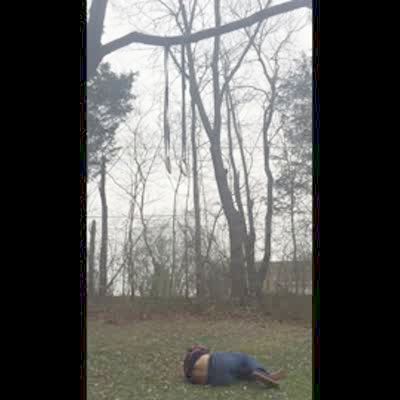 People cut down tree with chain saw. Tree falls & knocks entire corner of trailer / house down. Shaky camera. Boneheads.