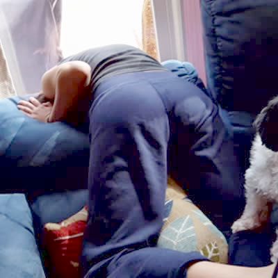 A teen girl gets her head stuck behind a recliner couch indoors. She stood on the couch and leaned over to get something and it reclined and jammed her head against a window.