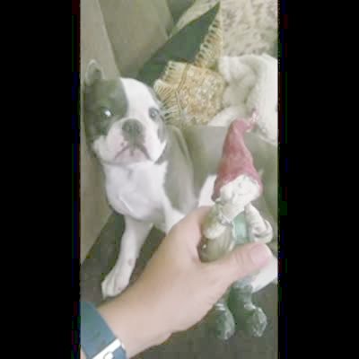 A Boston terrier puppy dog pushes a woman's hand away while she holds a garden gnome in her face and asks her what she did in a living room.