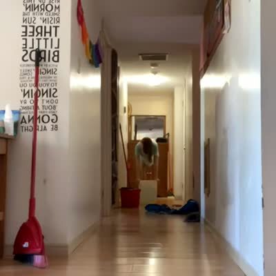 A teen girl pushes a bucket of water down a hallway but it catches on the floor and tips over, and the water spills all over the floor. She calls for her mom off camera, who asks, "is there water everywhere?"