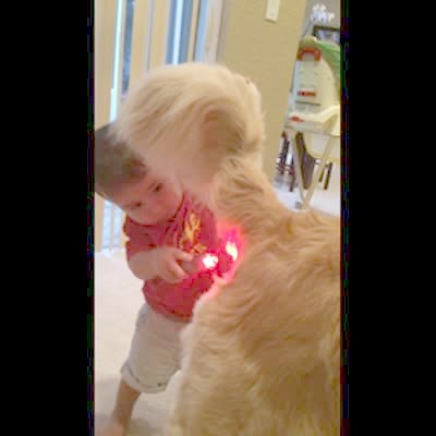 A tot boy uses a flashlight to look at a dog's butt.