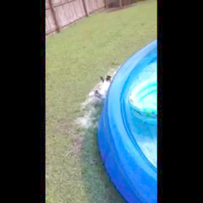 A small puppy dog walks along the edge of an inflatable pool to reach her doggie pool. Action starts at 1:25.