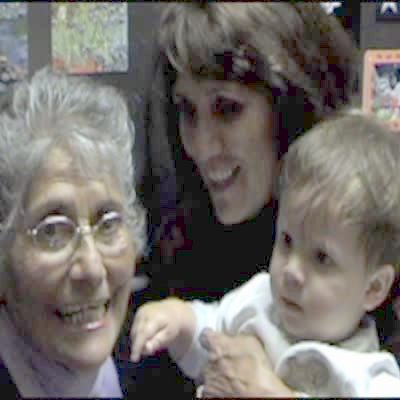 Toddler boy in mom's arms examines great grandma / senior woman's mouth and pulls out her dentures in the kitchen