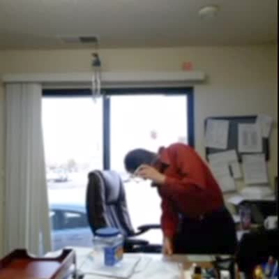 A man jumps when he sits on his desk and it sets off an air-horn. He examines his chair, then sits back down and the air-horn goes off again. Vine/instagram. Practical joke.