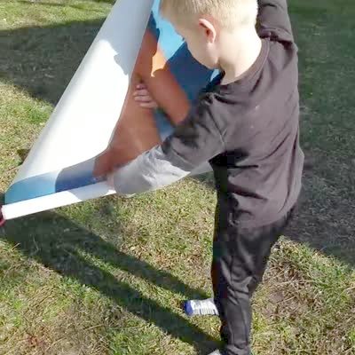 A young boy places a small soccer ball on top of a leaf blower in a yard and his father turns it on. The ball levitates above the leaf blower and the boy begins to scream and jump around as his brother appears and screams and jumps with him.