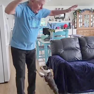 A senior man jumps up and down while a Boston terrier dog watches and then jumps on his leg.