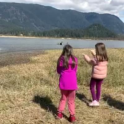 A dog in a lake suddenly runs towards his family, trips and falls, doing a front flip.