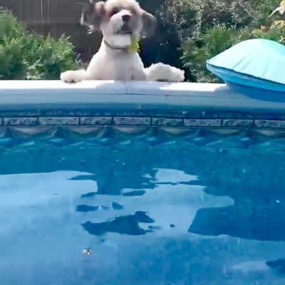 A Shih Tzu dog jumps up repeatedly at the ledge of a woman's above ground pool.