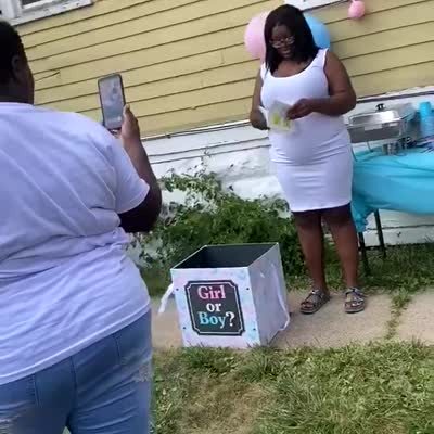 A woman reads a card that says she's pregnant with a baby girl at a gender reveal party, then she lies on the ground and another woman trips over her.