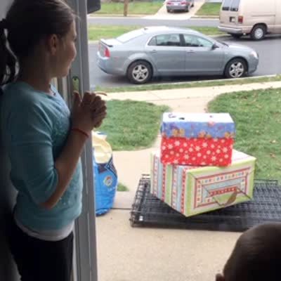 A brother and sister see a present on the front door. They see a dog poke it's head out and get excited and dance and scream around the house. AA: Christmas