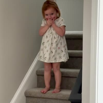 A young girl comes downstairs to see her birthday party set up and hits young boy in groin and says "oh my gosh" with excitement.