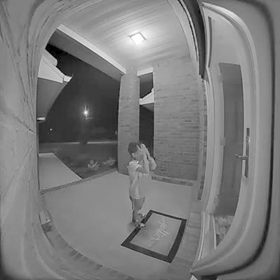 An excited young boy runs full speed into a storm door that closes just he's trying to enter the house. He hits his face on the glass, falls backwards onto the ground and cries on the front porch until his mother comforts him. Security camera footage.