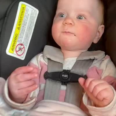 A woman gives a baby girl a taste of an ice cream sandwich and she smiles and laughs and makes an excited face in a stroller.