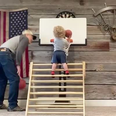 While he stands on ladder, a young boy shoots basketballs with his grandpa. He then gets excited after two swishes and topples forward off of the ladder and falls to the ground.