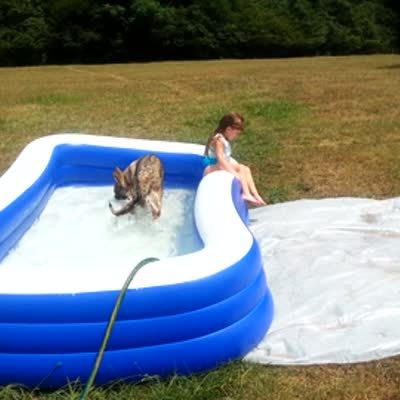 A young girl and a German shepherd play in an inflatable kiddie pool. The dog bounds in and out of the pool, knocking into the girl in its enthusiasm.