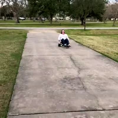 A woman says "this is fun" while she plays with a hoverboard go kart on a driveway, then she hits a bump and falls on her face.