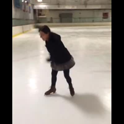 A woman spins on ice in a skating rink indoors and nearly falls but catches herself repeatedly before another woman falls and face plants in front of her.