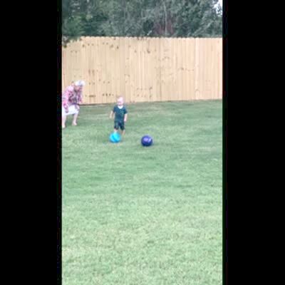 A senior woman kicks a ball in the backyard and accidentally hits her tot grandson in the back of the head then he falls down and face plants hard into the ground.