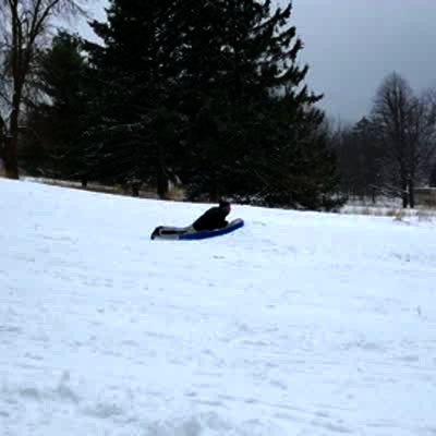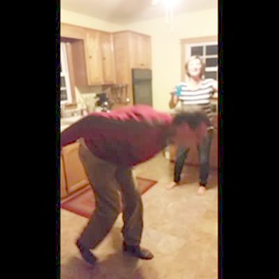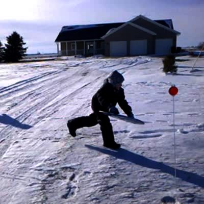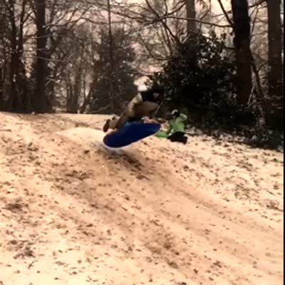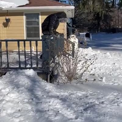 A man climbs up onto a fence around a porch and stands on it and tries to jump but it breaks and he faceplants in the snow and a woman laughs in the backyard.
