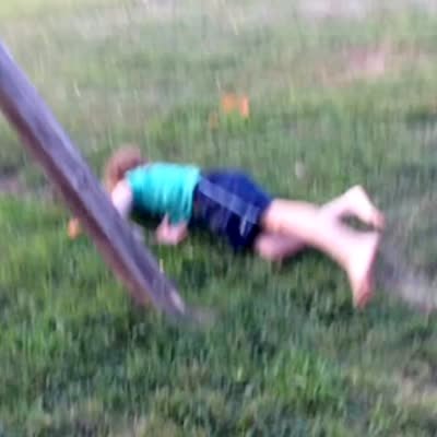 A woman rides down a toy rollercoaster track and falls forward on her face in a yard.