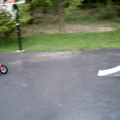A girl rides a toy tractor down a hill. She goes over a ramp and lands on her face.