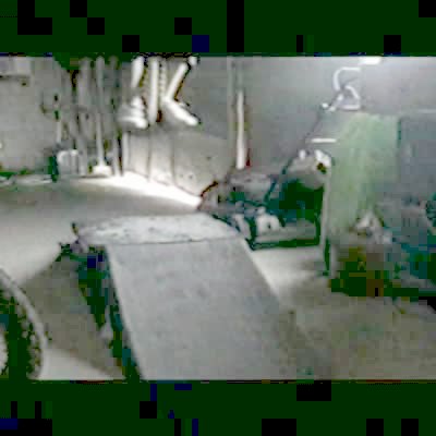 Boy on pogo stick rides up one side of a ramp in the basement. When he tries to go down, he falls off.