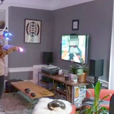 A young woman falls face first into the television stand as she plays a virtual reality video game.