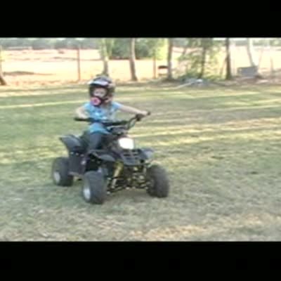 Little girl wearing helmet gets off ATV, runs towards camera, trips and falls, faceplants into sidewalk.