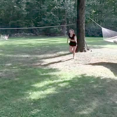 A woman in a yard attempts to do a front hand spring and backs of it when she sees a small dog run in front of her and she crashes and falls on her face.