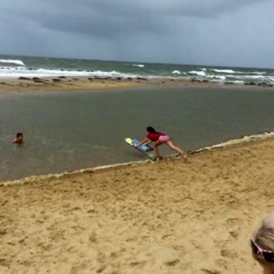 A young girl faceplants in the water when she tries to dive onto a boogie board.