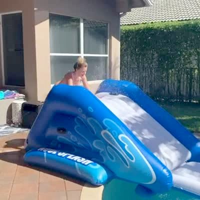 A woman jumps onto an inflatable pool slide and she faceplants at the bottom, then falls in the water.