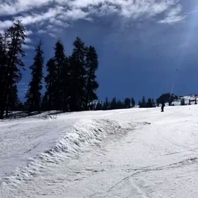 A teen boy goes off a jump in the winter snow and face plants on the landing.