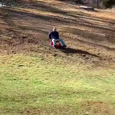 A man rides a kids stroller down a large hill, and his feet catch at the bottom and he flings into the air and faceplants.