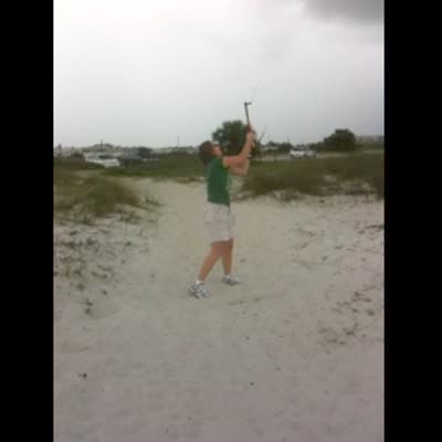 Woman tries to kitesurf on beach on a windy day and is yanked and dragged through the sand.