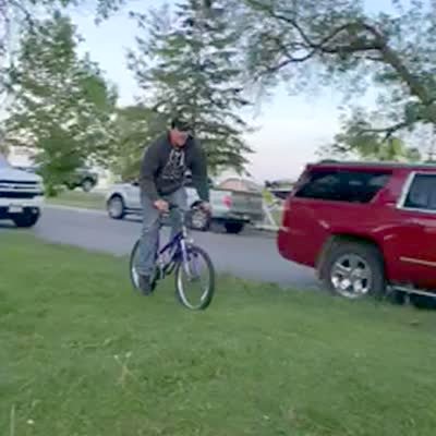 A man rides a scooter along a sidewalk and then goes up his driveway and crashes into a parked car.