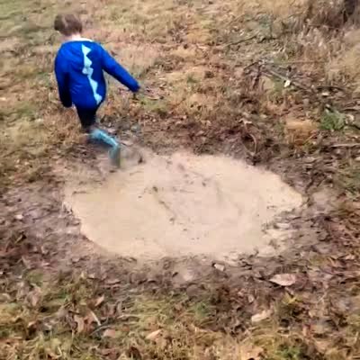 Two young boys play in a mud puddle when one faceplants into the puddle, spitting up water as he gets back up.