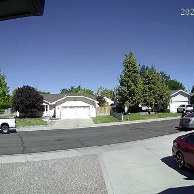 A woman with groceries in her hands runs straight into a parked car in a driveway. Security camera footage.