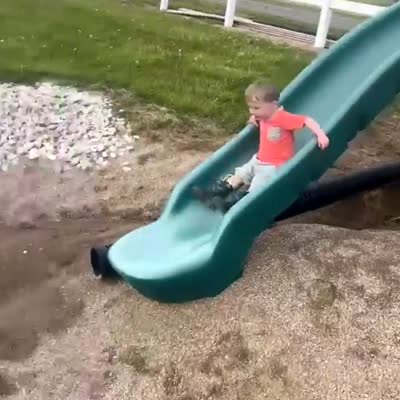 A young boy goes down a slide and lands at the bottom on his feet but falls onto his face near a pond.