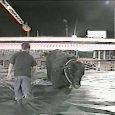 Woman riding mechanical bull gets thrown off as she tries to get on.