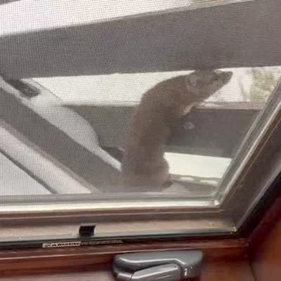 Action from 20 seconds to 32 seconds. A marten plays on the back deck of a house and then climbs up onto the fence and leaps down into the winter snow below.
