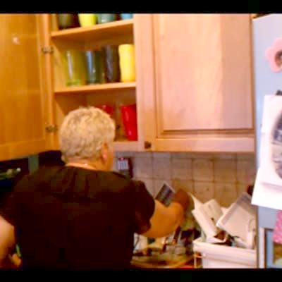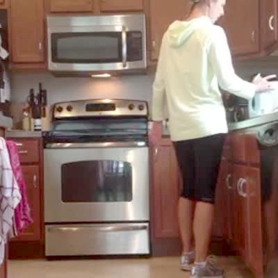 Woman screams when she sees a fake rat in a kitchen cupboard. boy laughs at her, admitting he had something to do with it.